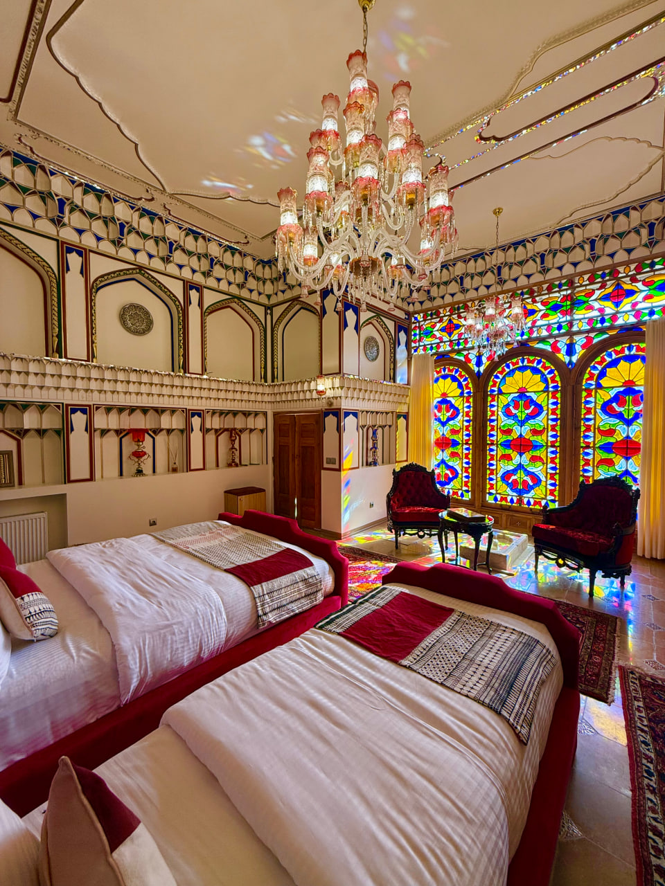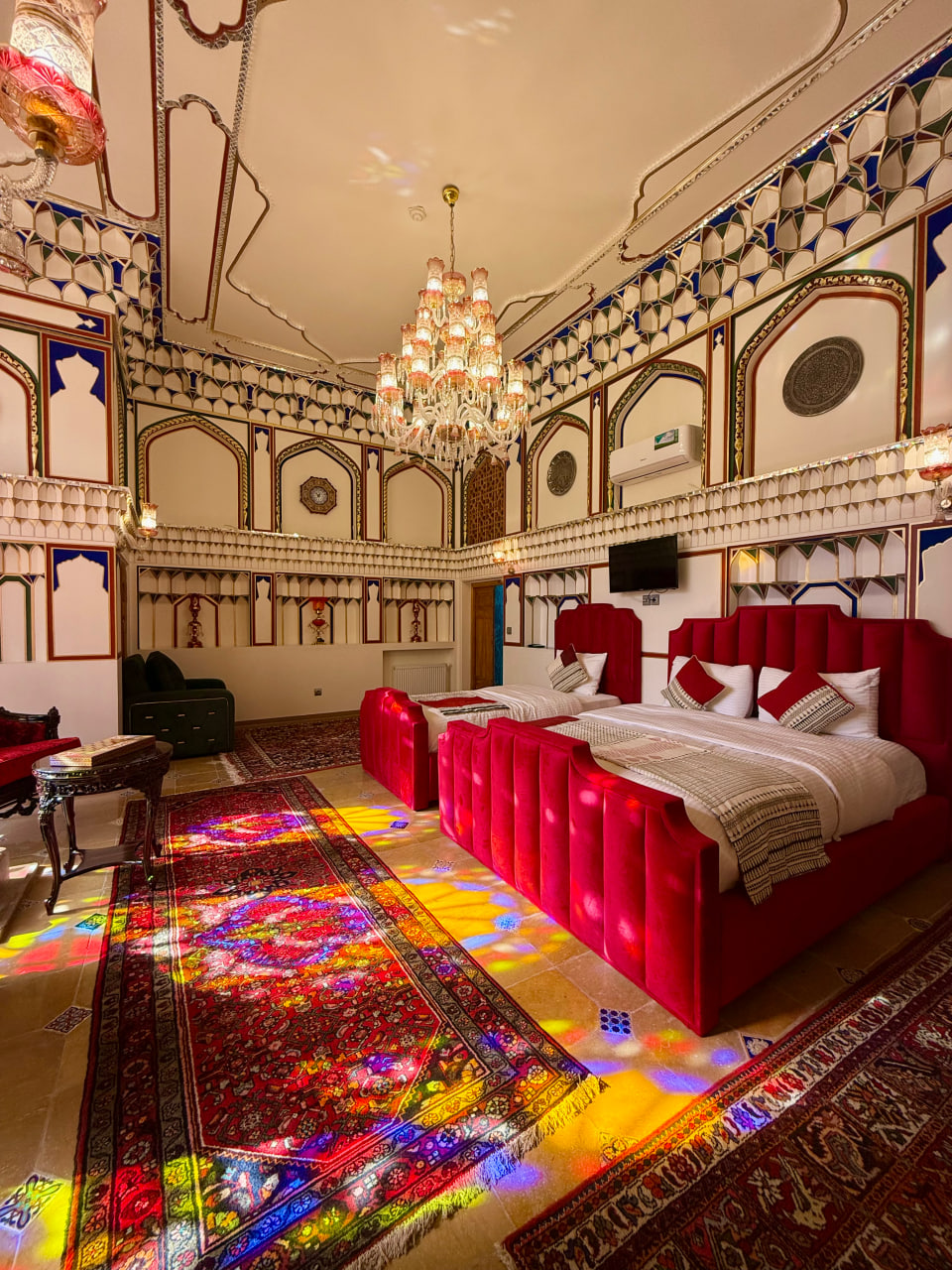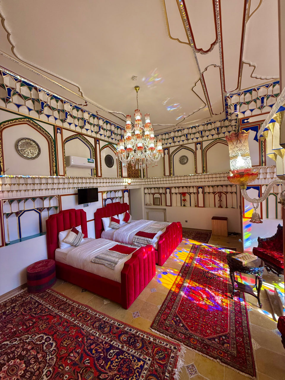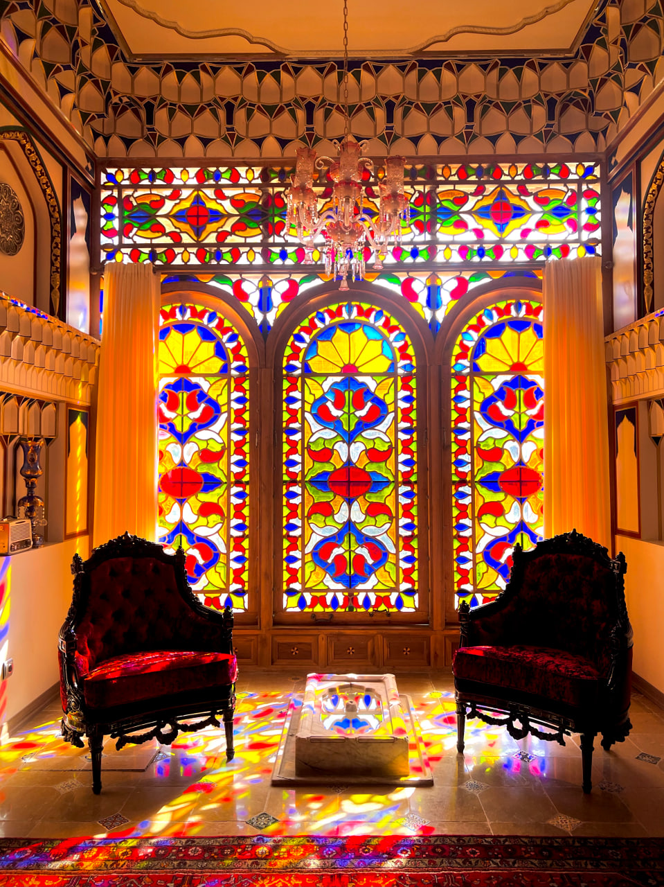 درهای ارسی و شیشههای رنگی، با عبور نور آفتاب، فضایی رویایی و رنگین میآفرینند که حال و هوای شاهنشینهای اصیل ایرانی را زنده میکند. طراحی سنتی در کنار فضای دلنشین و آرامشبخش، اقامتی متفاوت و بهیادماندنی را رقم میزند.